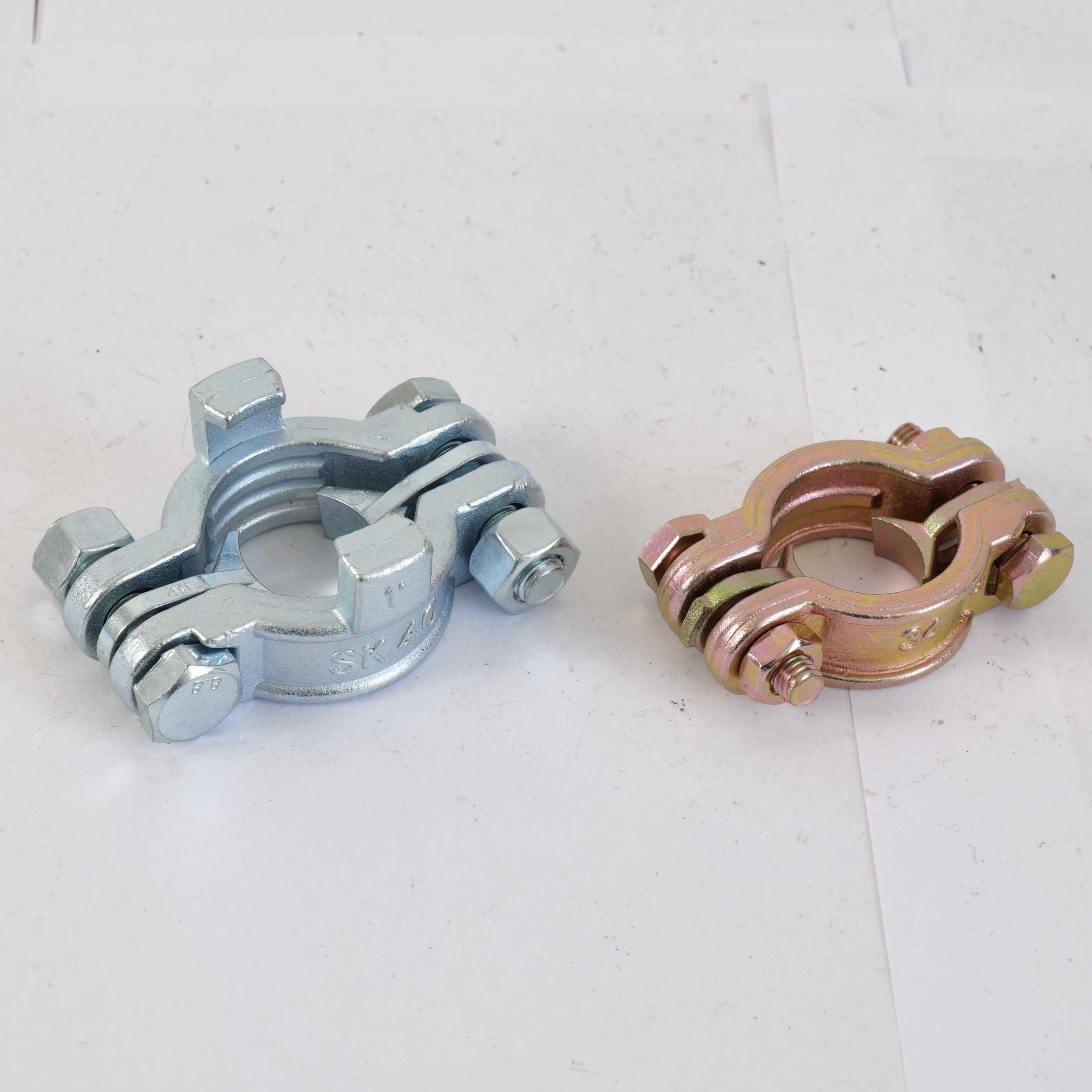 el El material de la abrazadera de doble perno es carbono. Acero, y material de latón y acero inoxidable también disponibles, la tecnología es Fundición de precisión. La superficie es de color plateado chapado en Zn o de color amarillo.